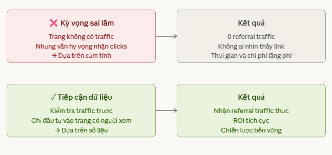 Nếu một trang không có traffic, việc kỳ vọng referral traffic gần như không thực tế. Dù link được đặt đúng ngữ cảnh, người dùng vẫn không thể click nếu họ không nhìn thấy nội dung đó. SEO cần dựa trên dữ liệu thay vì cảm tính.