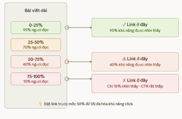 Nếu link nằm quá sâu trong bài viết, người dùng có thể rời trang trước khi chạm tới nó. Scroll depth thấp đồng nghĩa với khả năng click thấp. Điều này đặc biệt rõ trên thiết bị di động.