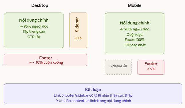 Phần lớn người dùng không cuộn xuống footer, đặc biệt trên thiết bị mobile. Sidebar cũng thường bị bỏ qua vì người đọc tập trung vào nội dung chính. Vì vậy, những vị trí này hiếm khi tạo referral traffic đáng kể.