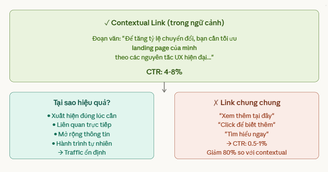 Contextual link được đặt trong đoạn nội dung liên quan trực tiếp đến vấn đề người đọc quan tâm. Khi người dùng đang tìm câu trả lời và link xuất hiện như một giải pháp mở rộng, khả năng click sẽ cao hơn đáng kể.