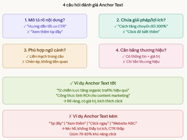 Anchor text đóng vai trò như lời mời gọi hành động. Nếu anchor text quá chung chung như “tại đây” hoặc “xem thêm”, người dùng sẽ không cảm nhận được giá trị khi click. Anchor cần gợi mở lợi ích cụ thể.