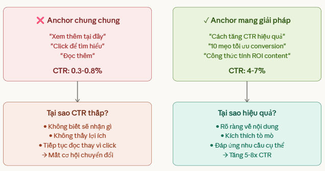 Ngược lại, anchor text mang tính giải pháp như “cách tăng CTR hiệu quả” sẽ kích thích sự tò mò và nhu cầu tìm hiểu thêm. Sự rõ ràng trong thông điệp giúp tăng tỷ lệ click đáng kể.