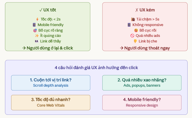 Thiết kế rõ ràng, dễ đọc và phân cấp nội dung hợp lý giúp link nổi bật tự nhiên. UX tốt không chỉ giữ chân người dùng mà còn tạo điều kiện để họ thực hiện hành vi click.