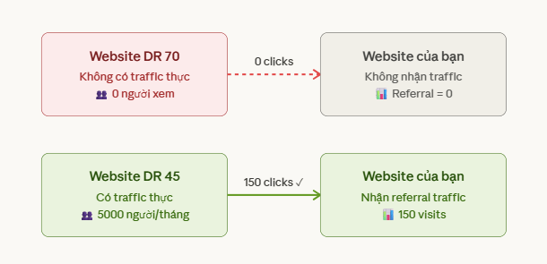 Nhiều người làm SEO vẫn đặt nặng Domain Rating mà quên rằng referral traffic đến từ người dùng thật. Một trang có DR cao nhưng không có lượt truy cập sẽ không thể tạo click. Ngược lại, một trang có traffic ổn định và đúng tệp người dùng thường mang lại referral traffic chất lượng hơn.