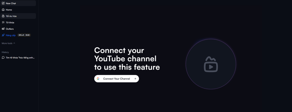 Ở tab bên trái, bạn hãy truy cập vào chức năng “Tối ưu hóa”, để kết nối với kênh Youtube của bạn, bạn hãy chọn vào “Connect Your Channel” Người dùng đăng nhập bằng tài khoản Google đang quản lý kênh YouTube và cho phép vidIQ truy cập các dữ liệu cần thiết. Bước này giúp công cụ có thể phân tích video, theo dõi hiệu suất nội dung và hỗ trợ nghiên cứu từ khóa hiệu quả hơn.