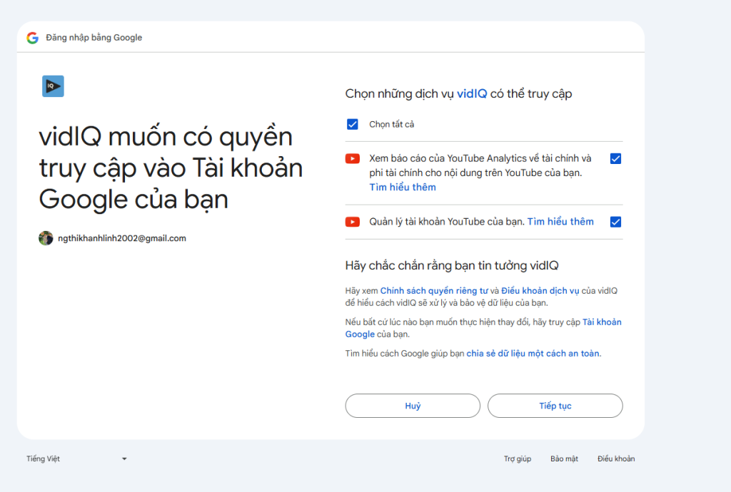 Sau khi cài đặt tiện ích thành công, bước tiếp theo là kết nối vidIQ với kênh YouTube của bạn. Việc liên kết tài khoản giúp công cụ truy cập dữ liệu video và cung cấp các chỉ số phân tích phục vụ quá trình nghiên cứu từ khóa. Khi kết nối hoàn tất, vidIQ có thể hiển thị thông tin SEO ngay trong giao diện quản lý video.