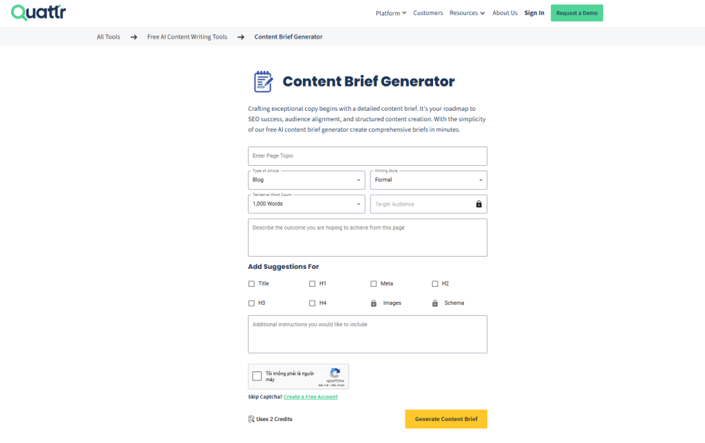 Quattr là công cụ tạo content brief đơn giản, giá rẻ, phục vụ nhu cầu tạo brief nhanh cho cá nhân và nhóm nhỏ. Nó cho phép sinh outline, gợi ý heading và từ khóa phụ cơ bản. Ưu điểm lớn của Quattr là tốc độ và chi phí thấp, giúp những người mới bắt đầu có thể nhanh chóng có brief để viết.