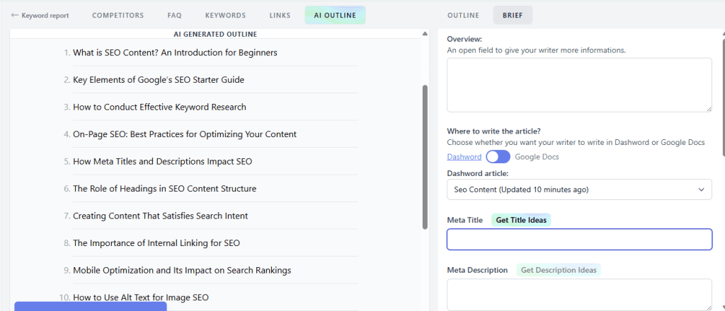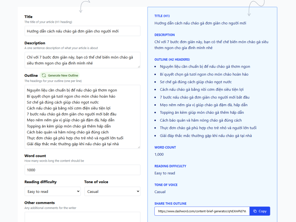Dashword cung cấp một quy trình tạo content brief đơn giản và hướng đến người dùng không chuyên. Công cụ cho phép nhập từ khóa, chọn intent, và tự động sinh outline kèm gợi ý từ khóa, các câu hỏi cần trả lời và tông giọng. Điểm khác biệt là Dashword nhắm đến tính thực tiễn: brief đầu ra rõ ràng, dễ hiểu cho writer và không quá nhiều thông số rối.