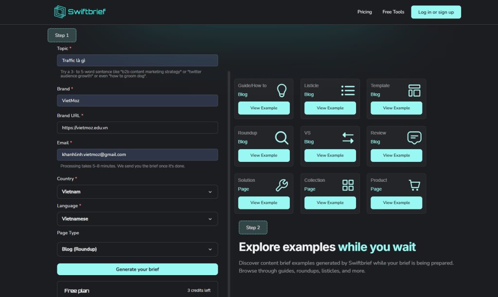 Swiftbrief là công cụ tạo content brief tập trung vào phân tích SERP sâu và gợi ý cấu trúc theo “best practice” của từng loại nội dung. Khi chạy brief, công cụ phân tích các văn bản top để trích xuất các ý chính, kiểu heading phổ biến, và các yếu tố thường xuất hiện trong snippet. Swiftbrief hướng đến việc giúp writer tiết kiệm công đoạn nghiên cứu ban đầu và tập trung vào việc viết phần nội dung có giá trị gia tăng.