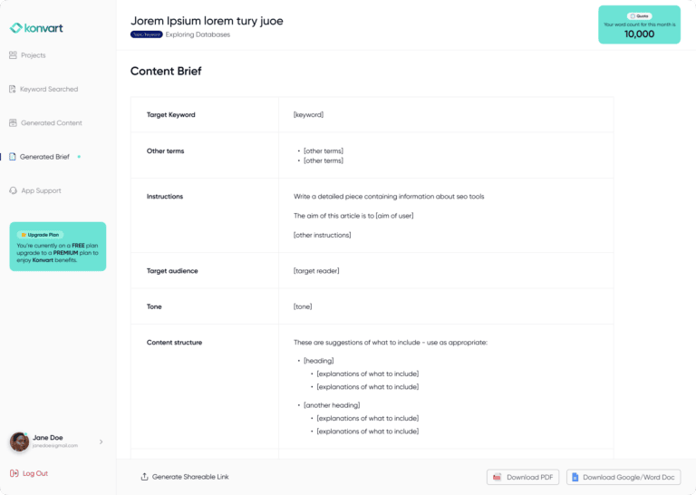 Konvart nổi bật ở khả năng hướng dẫn writer một cách chi tiết cho từng heading. Thay vì chỉ đưa ra outline, Konvart mô tả nội dung cần viết cho mỗi mục, đề xuất các nguồn tham chiếu và gợi ý cách trình bày để đạt mục tiêu SEO. Công cụ tạo content brief này phù hợp khi bạn muốn brief không chỉ là dàn ý mà còn là hướng dẫn sản xuất nội dung chi tiết.