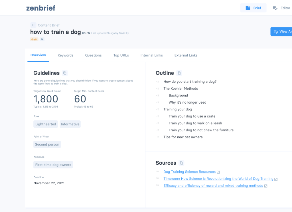 Zenbrief hướng đến việc tối ưu hoá quy trình tạo brief ở quy mô đội nhóm. Công cụ tích hợp các yếu tố như outline, từ khóa theo chủ đề, đề xuất internal link và cả các chỉ dẫn về tông giọng, độ dài, và CTA. Zenbrief còn hỗ trợ theo dõi tiến độ thực hiện brief và quản lý đánh giá sau khi bài xuất bản.