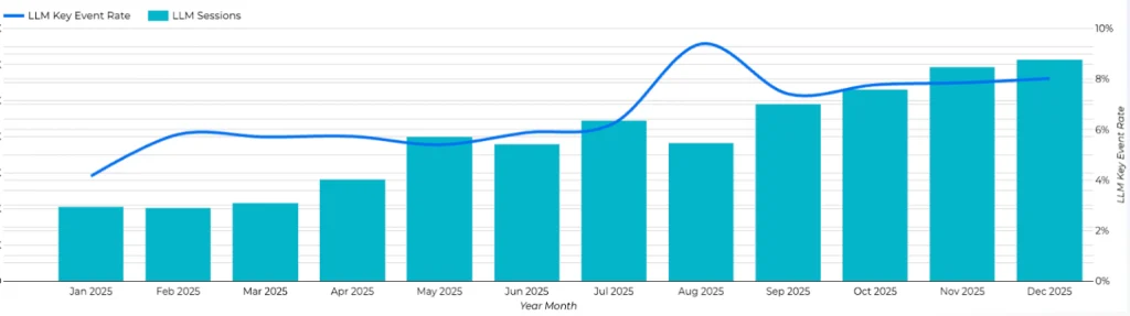 Để tìm hiểu sâu về việc traffic từ LLM đang ảnh hưởng đến các chỉ số chính như thế nào, chúng tôi đã phân tích tập dữ liệu về lưu lượng giới thiệu (referral traffic) từ các câu lệnh (prompt) LLM trên Google Analytics của toàn bộ hệ thống khách hàng trong 13 tháng qua (từ 01/01/2025 đến 07/02/2026).