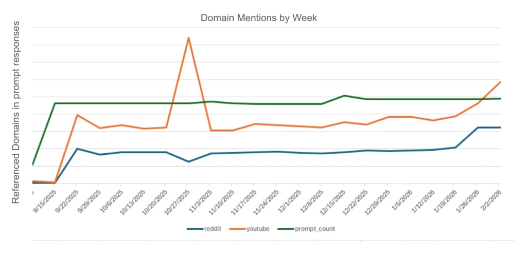 Các liên kết và trích dẫn từ YouTube đã tăng lên trong 30 ngày qua. Reddit cũng ghi nhận sự tăng trưởng tương tự, mặc dù lượng truy cập này gần đây đã bắt đầu đi ngang (bão hòa). Sự dịch chuyển trong các nguồn trích dẫn và liên kết này sẽ ảnh hưởng trực tiếp đến lượng truy cập cuối cùng đổ về website của bạn; đồng thời, chúng cũng có thể tác động đến chiến lược quảng cáo và nội dung của thương hiệu. Nếu bạn không theo dõi dữ liệu này, bạn sẽ không thể nhận thấy những thay đổi đó. Bản thân các mô hình LLM không cung cấp trực tiếp thông tin này — bạn chỉ có thể tiếp cận được chúng thông qua các công cụ của bên thứ ba.