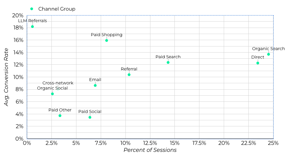 - Tỷ lệ chuyển đổi cực cao: So với các kênh khác, LLM có tỷ lệ chuyển đổi (conversion rate) lên tới 18%.