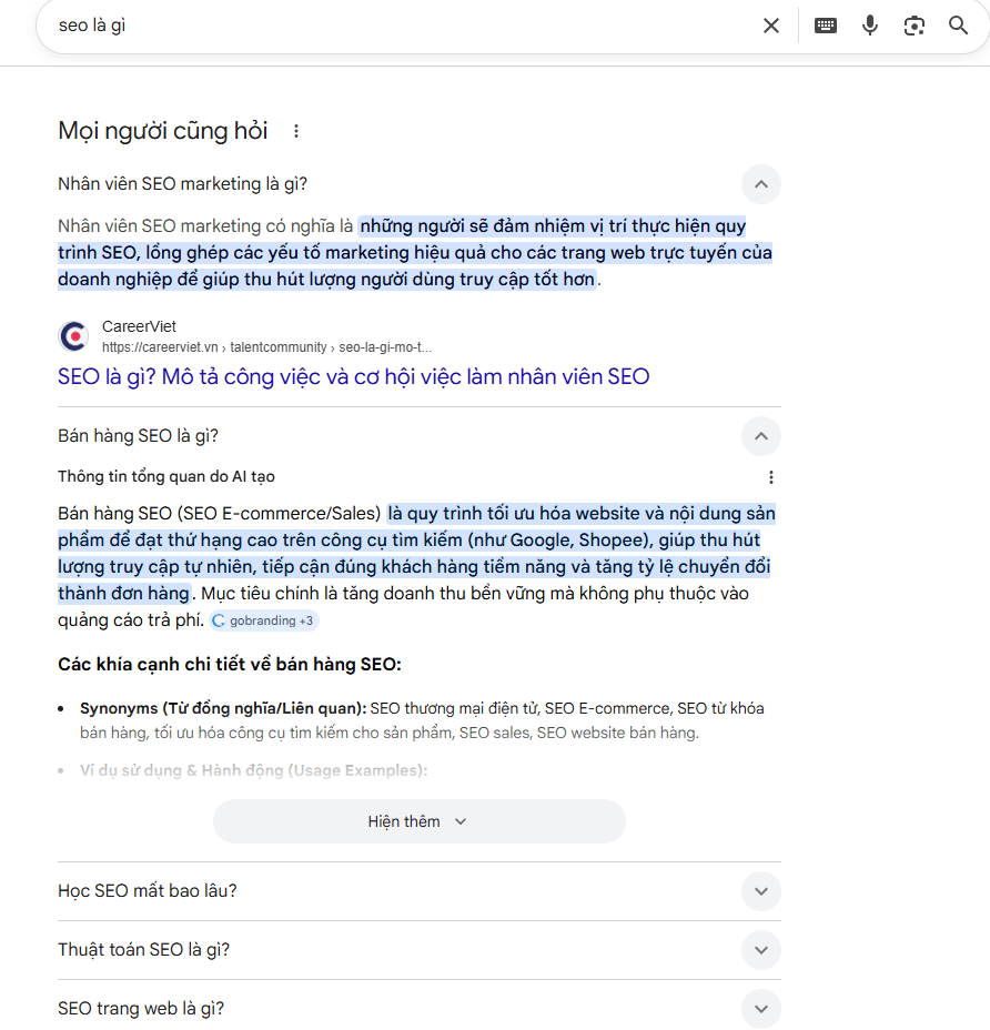 Featured Snippets là những đoạn trích nổi bật xuất hiện trên trang đầu của kết quả tìm kiếm Google, giúp người dùng nhanh chóng tìm thấy câu trả lời cho các truy vấn của họ mà không cần phải truy cập vào các liên kết khác. Những đoạn này thường được trình bày dưới dạng một đoạn văn, danh sách hoặc bảng, nhằm giúp tiết kiệm thời gian và nâng cao trải nghiệm tìm kiếm của người dùng. Việc xuất hiện ở vị trí này không chỉ mang lại cho người dùng thông tin hữu ích mà còn giúp các trang web có thêm cơ hội tăng lượng truy cập và khả năng hiển thị.