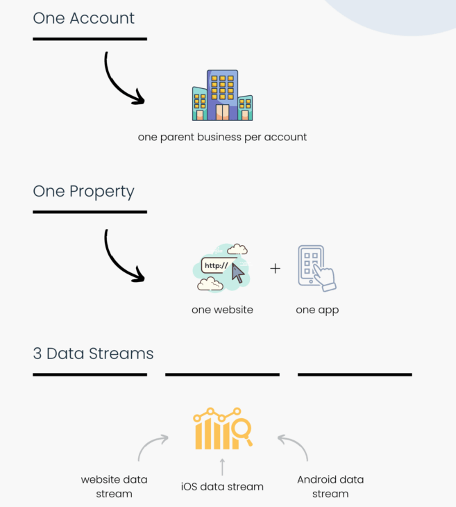 Trong Google Analytics, kiến trúc hệ thống được tổ chức theo mô hình phân tầng. Cấu trúc này giúp người làm SEO quản lý dữ liệu rõ ràng theo từng cấp độ, từ tài khoản tổng đến từng website hoặc luồng dữ liệu cụ thể.