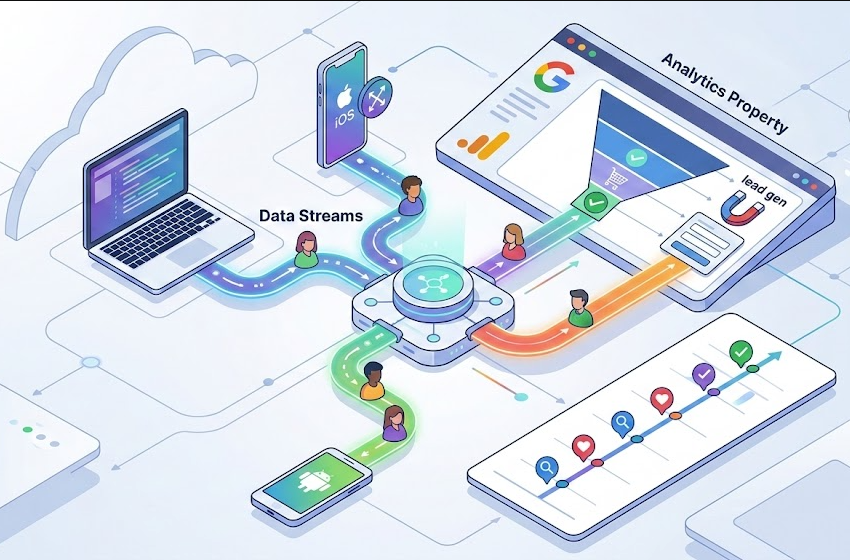 Google Analytics cho phép hợp nhất dữ liệu từ website và ứng dụng di động vào cùng một property, giúp bức tranh hành vi người dùng trở nên liền mạch hơn. Thay vì phân tách dữ liệu như trước đây, GA sử dụng Data Streams để kết nối Web – iOS – Android, tạo thành dòng dữ liệu thống nhất và nhất quán. Điều này giúp doanh nghiệp hiểu rõ hành trình người dùng từ lúc tiếp cận đến khi chuyển đổi trên nhiều thiết bị khác nhau.
