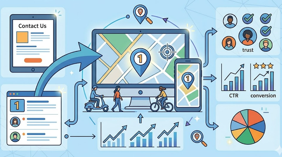 Sau khi tạo hồ sơ Google Maps, bạn nên nhúng bản đồ vào trang Liên hệ trên website. Điều này giúp người dùng dễ dàng tìm đường và tăng độ tin cậy cho doanh nghiệp. Ngoài ra, sự liên kết giữa website và hồ sơ Maps giúp củng cố tín hiệu địa phương. Song song đó, tối ưu website theo Local SEO giúp bạn xuất hiện cả trong kết quả Map Pack và kết quả tìm kiếm tự nhiên. Điều này tạo ra nhiều điểm chạm hơn với khách hàng và tăng cơ hội vượt qua đối thủ trong cùng khu vực.