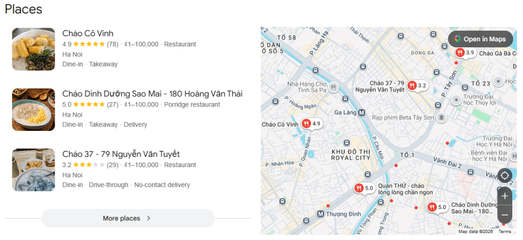 Trong Google Local Pack, doanh nghiệp được hiển thị kèm theo vị trí địa lý, thông tin liên hệ, giờ mở cửa và các thông tin hữu ích khác. Người dùng có thể nhấp vào từng doanh nghiệp để xem chi tiết, gọi điện trực tiếp hoặc mở Google Maps để nhận chỉ đường đến địa điểm thực tế.