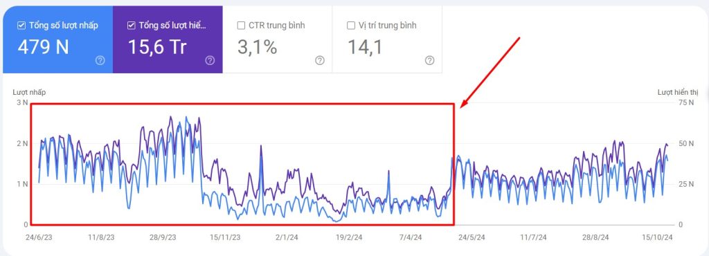 Bạn sử dụng Google Search Console hoặc Google Analytics 4 để xem dữ liệu theo từng ngày thay vì theo tháng. Bạn cần tìm đúng ngày hoặc khoảng thời gian traffic lao dốc rõ rệt và kiểm tra xem sự sụt giảm xảy ra trên toàn site hay chỉ một nhóm URL cụ thể. - Bước 2: Đối chiếu với lịch sử cập nhật thuật toán: