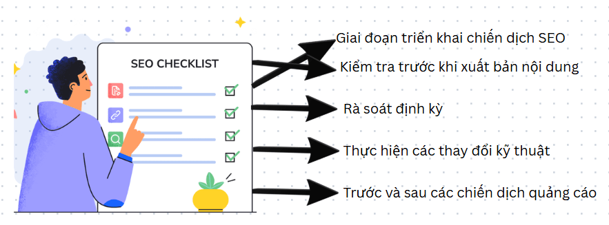 Checklist SEO thường được sử dụng trong nhiều giai đoạn của quy trình SEO, tuy nhiên, có một số thời điểm đặc biệt mà checklist này trở nên thiết yếu hơn bao giờ hết. Một số giai đoạn quan trọng trong thực hiện dự án SEO mà checklist có thể đóng vai trò quan trọng: