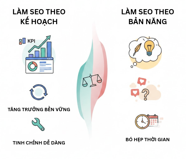 - Khả năng duy trì: Hiệu quả của SEO có kế hoạch thường bền vững hơn với tuần tự nội dung rõ ràng, trong khi viết theo cảm hứng phụ thuộc vào yếu tố thời điểm marketing.
