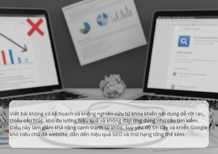 Viết bài không có kế hoạch thường khiến SEOer gặp phải các rủi ro về nội dung không tối ưu và thiếu định hướng. Nội dung viết theo cảm hứng một cách tự phát thường dễ dẫn đến việc không đáp ứng đủ các yếu tố tối ưu hóa, làm giảm hiệu quả SEO và khả năng tiếp cận độc giả.