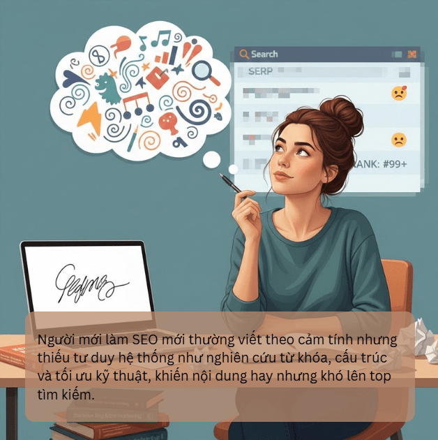 Nhiều SEOer mới coi viết content SEO như một cách để thể hiện sự sáng tạo cá nhân. Tuy nhiên, điều này không phải lúc nào cũng đồng nghĩa với việc tối ưu hóa bài viết cho công cụ tìm kiếm. Ban đầu, có thể họ chỉ chú trọng vào việc sáng tạo nội dung hấp dẫn, nhưng không nhận thức rõ tầm quan trọng của nghiên cứu từ khóa, cấu trúc nội dung và các yếu tố kỹ thuật khác.