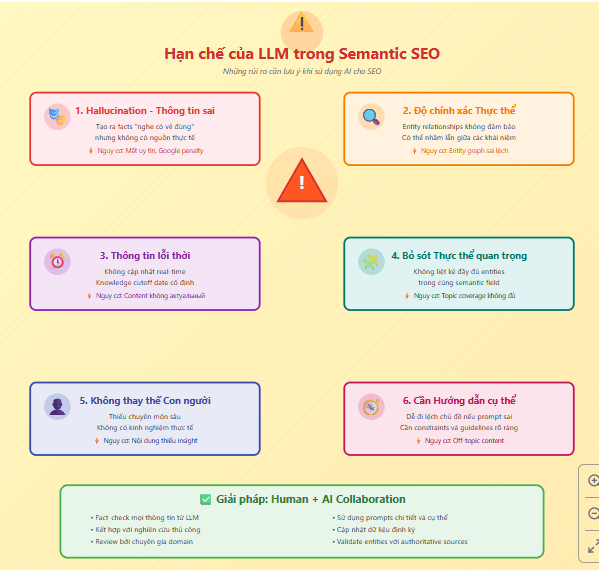 Dù LLM hỗ trợ rất nhiều cho việc tạo và tối ưu nội dung theo hướng ngữ nghĩa, chúng vẫn tồn tại những giới hạn mà người làm SEO cần nhận diện để tránh phụ thuộc hoàn toàn vào mô hình. Những hạn chế này ảnh hưởng trực tiếp đến chất lượng nội dung, tính chính xác của thực thể và khả năng xếp hạng trên công cụ tìm kiếm.