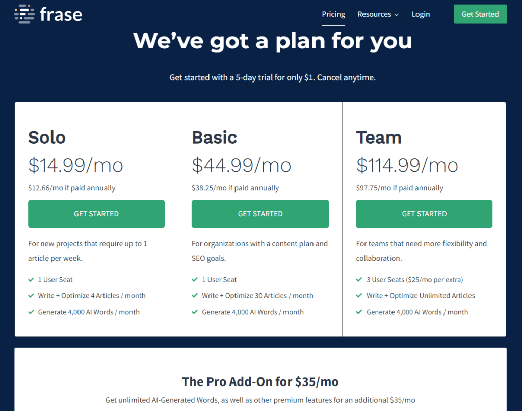 Frase cung cấp ba gói chính: Solo, Basic và Team. Gói Solo dành cho cá nhân hoặc freelancer, giới hạn khoảng 4–5 bài mỗi tháng. Gói Basic phù hợp với nhóm nhỏ cần sản xuất nội dung thường xuyên, còn gói Team hướng tới agency hoặc doanh nghiệp muốn tích hợp Frase vào quy trình SEO tổng thể. So với các đối thủ như SurferSEO, giá Frase tương đối dễ tiếp cận, nhất là khi xét đến lượng tính năng đi kèm.