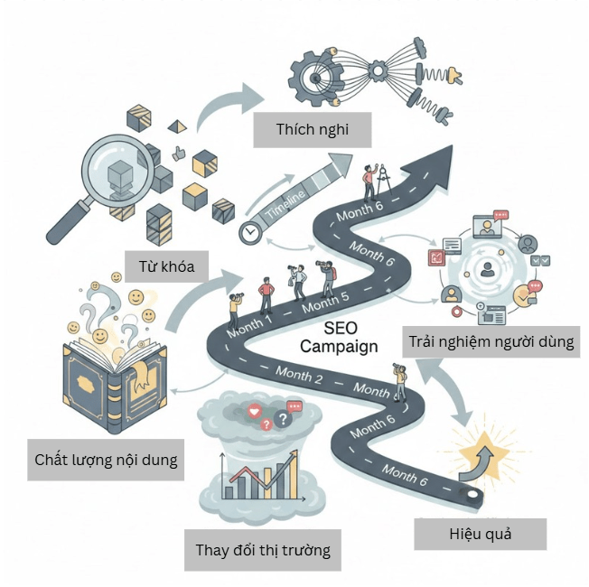 Các yếu tố ảnh hưởng đến tiến độ của một chiến dịch SEO kéo dài 6 tháng rất đa dạng, từ sự sẵn có của tài nguyên, đội ngũ thực hiện đến sự phát triển của thị trường và công nghệ.