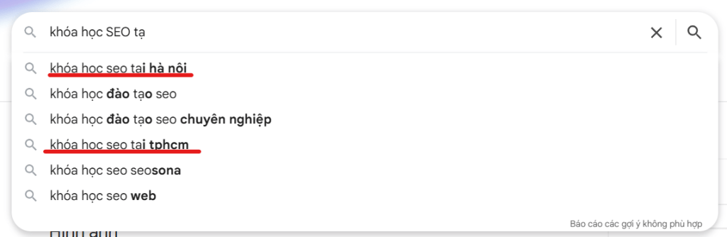 Ví dụ: Từ khóa “khóa học SEO tại Hà Nội” cho thấy người tìm kiếm không chỉ quan tâm đến khóa học SEO mà còn yêu cầu vị trí cụ thể. Người dùng mong đợi thông tin trung tâm đào tạo tại Hà Nội, địa chỉ, lịch học, học phí, đánh giá và khả năng tham gia trực tiếp. Nếu nội dung không nhắc tới địa lý hoặc không liên quan khu vực, Google và người dùng đều đánh giá thấp mức độ phù hợp.