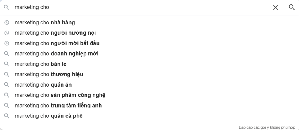 Google autocomplete (thường được biết đến với tên gọi Google Suggest). Bạn có thể sử dụng chức năng gợi ý các từ khóa liên quan của Google khi tìm kiếm một từ khóa nào đó.