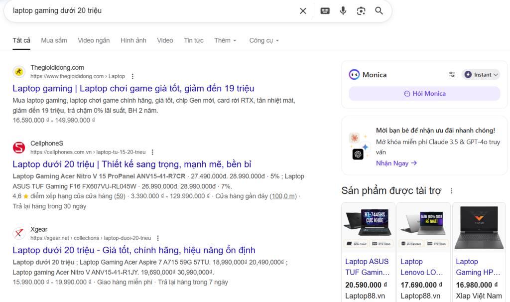 Ví dụ: Từ khóa “laptop gaming dưới 20 triệu” cho thấy người dùng đã xác định rõ nhu cầu mua laptop chơi game và đang lọc theo mức giá. Người tìm kiếm mong đợi danh sách sản phẩm phù hợp ngân sách, cấu hình đủ chơi game, đánh giá hiệu năng, ưu nhược điểm và gợi ý lựa chọn tốt nhất. Nếu nội dung không bám sát tiêu chí “gaming” hoặc “dưới 20 triệu”, khả năng thoát trang sẽ cao vì không đúng mục tiêu tìm kiếm.