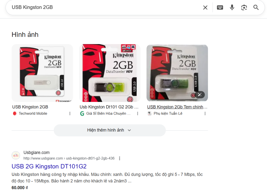 Ví dụ: Từ khóa “USB Kingston 2GB” cho thấy người tìm kiếm đã biết đến thương hiệu Kingston và đang tìm đúng sản phẩm thuộc thương hiệu này. Intent của truy vấn này rất rõ ràng, người dùng thường mong đợi thông tin sản phẩm chính hãng, giá bán, nơi mua uy tín hoặc so sánh giữa các nhà cung cấp. Nếu doanh nghiệp không chạy quảng cáo cho từ khóa thương hiệu, đối thủ có thể khai thác và thu hút khách hàng ngay tại giai đoạn họ đã có nhu cầu cao.