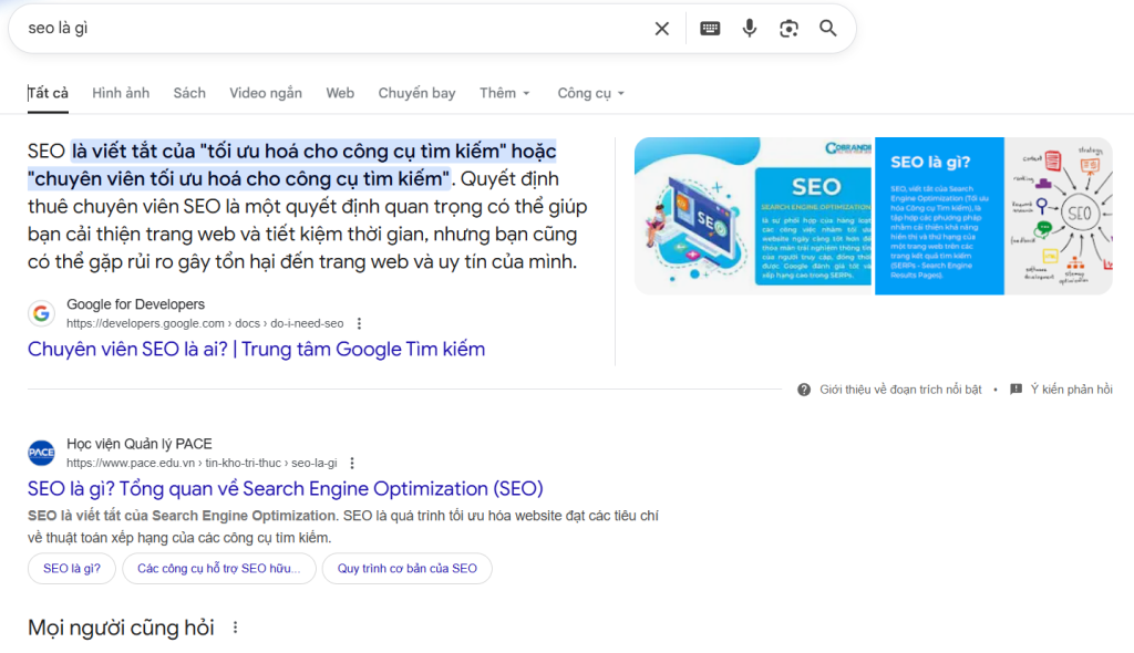 Đây là từ khóa thuộc nhóm Informational Intent vì người tìm kiếm chỉ muốn hiểu khái niệm SEO, chưa có nhu cầu mua dịch vụ hay công cụ.