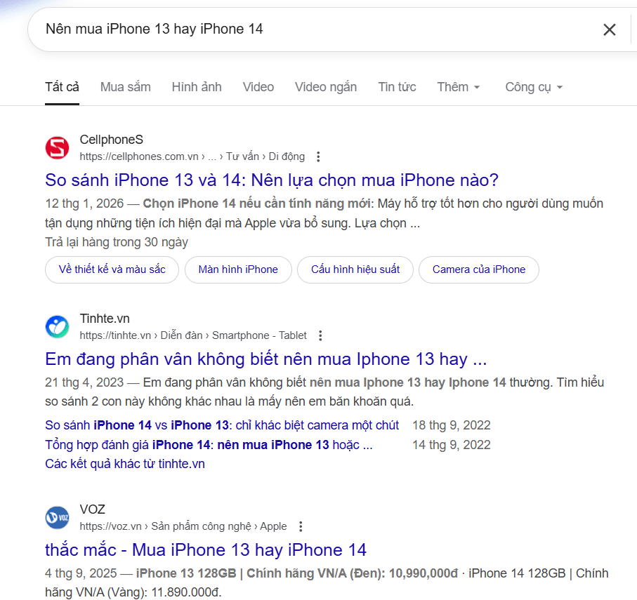 Ví dụ: Từ khóa “Nên mua iPhone 13 hay iPhone 14”