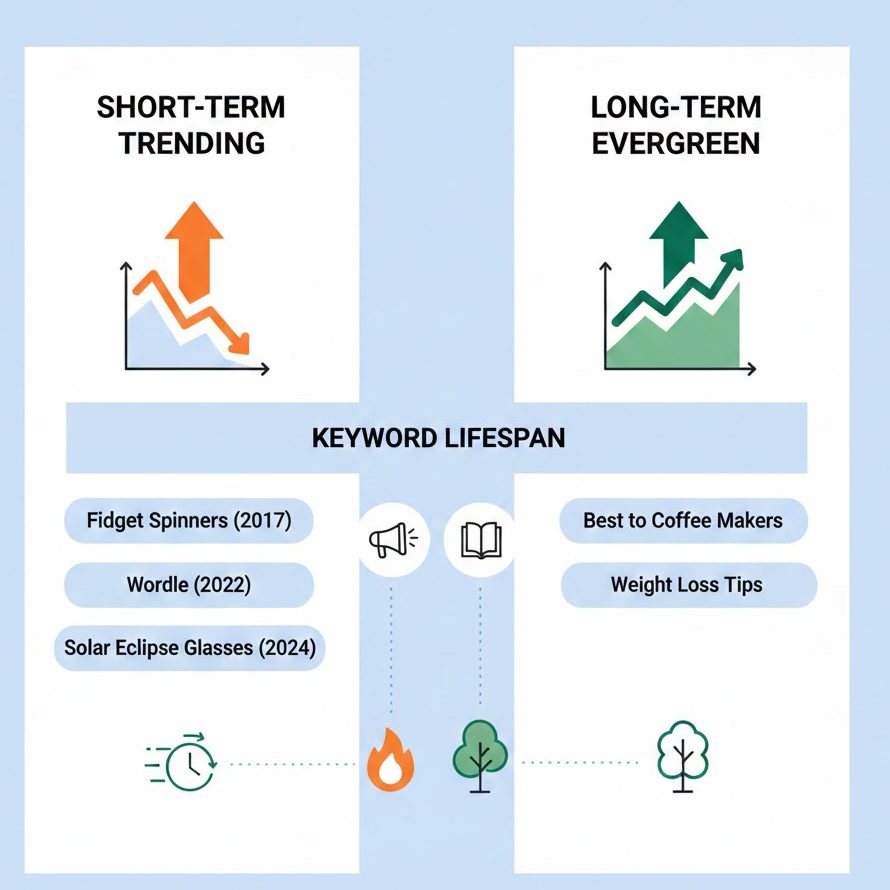 Khác với từ khóa ngắn hạn hoặc từ khóa theo xu hướng vốn chỉ bùng nổ trong một thời điểm như sự kiện, tin tức hoặc sản phẩm mới, từ khóa dài hạn mang lại traffic ổn định, đều đặn và có giá trị lâu dài cho SEO. Nội dung tối ưu cho nhóm từ khóa này thường có tuổi thọ cao, ít phải cập nhật liên tục nhưng vẫn duy trì khả năng thu hút người tìm kiếm.